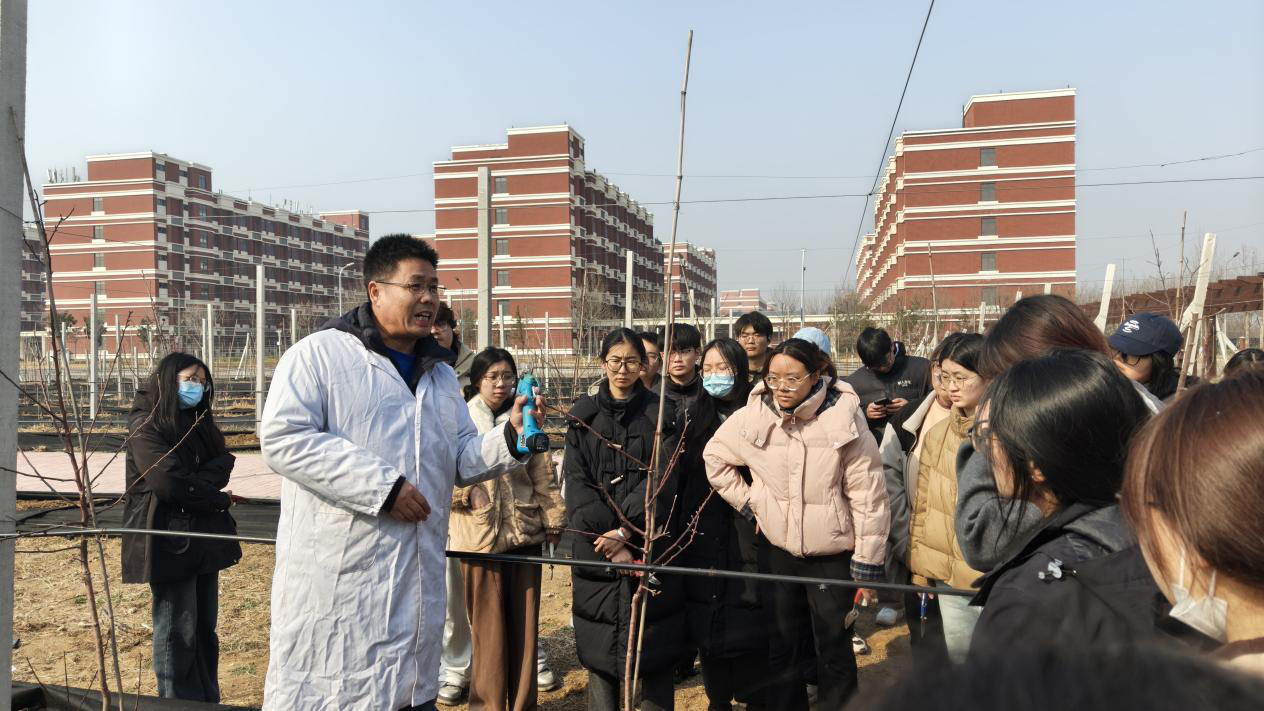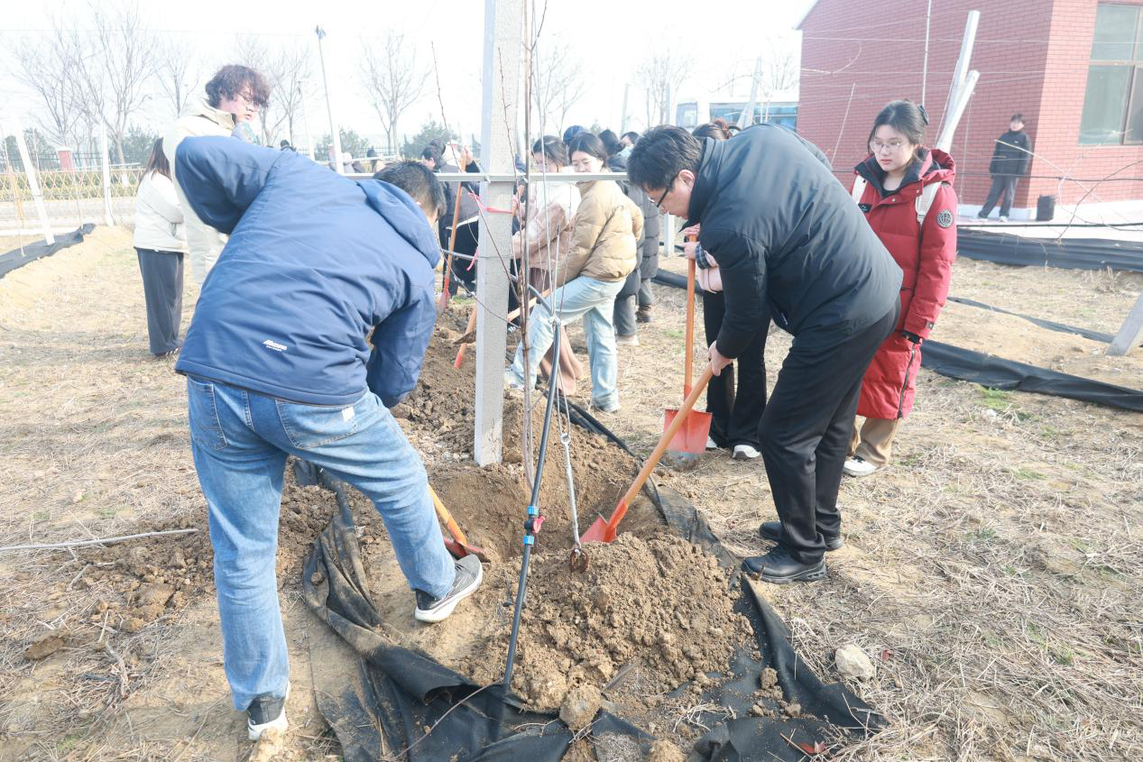 活动现场,果树学专家张玉刚、段艳欣、宋健坤、崔振华为学生们详细讲解春季果园管理要点,重点围绕不同树种的整形修剪原则、病枯枝识别及补种苗木栽植技术进行现场示范,从剪口角度到留芽方向,从挖坑深度到培土浇水,逐一讲解、手把手教学。师生们分组协作,干劲十足。同学们热情高涨,与专业教师协同完成苹果、桃、葡萄等果树的补种任务,并对已有果树进行精细修剪。