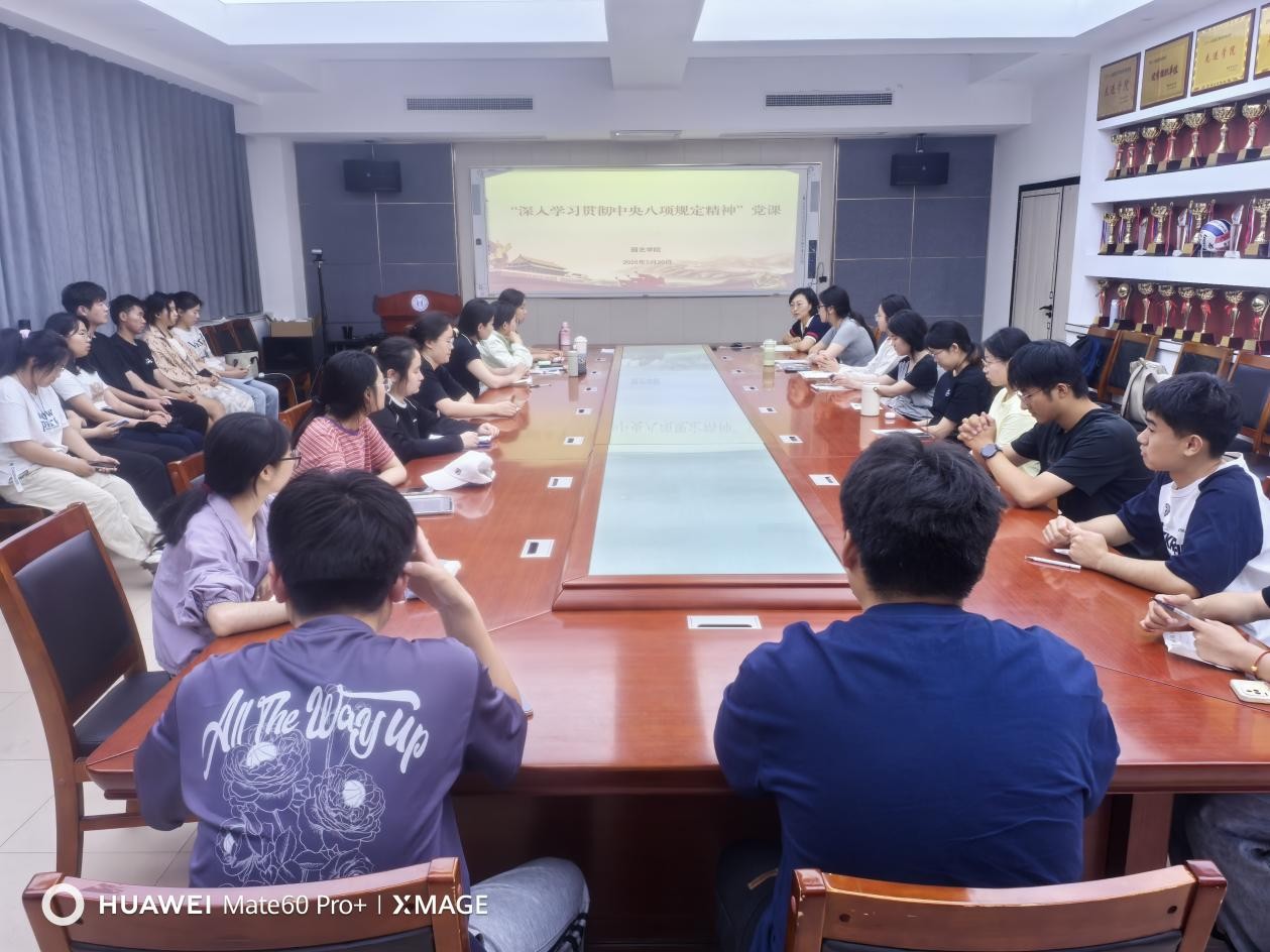 5月20日,太阳成集团tyc33455第五党支部书记刘凝在生物楼N306为入党积极分子讲授“深入贯彻中央八项规定精神学习教育”主题党课。刘凝围绕习近平总书记关于加强党的作风建设的重要论述,为学生阐释了中央八项规定及其实施细则精神的实质内涵。她向与会学生提出三点要求,一是要坚定理想信念,强化理论学习,以党的创新理论武装头脑、指导实践;二是要树立优良作风,以本次学习教育为契机,学深悟透习近平总书记关于加强党的作风建设的重要论述,树牢纪律观念,提升个人修养;三是要发挥模范带头作用,时刻以党员的标准严格要求自己,践行奉献精神,积极服务学院高质量发展。
