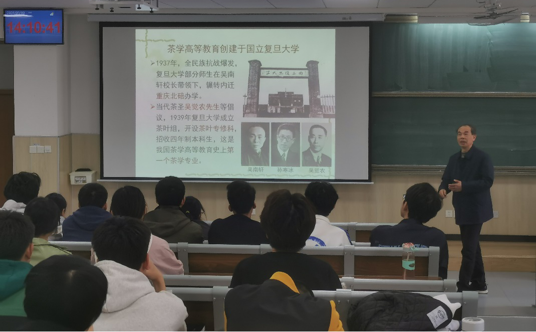 夏涛教授从我国古代茶学的萌芽开始讲起,到近代茶学教育的诞生,再到茶学高等教育的发生发展史,穿针引线,娓娓道来。他强调,茶学兼具自然科学和人文科学的双重属性,极富中国特色。年轻的“小茶人”生逢盛世兴茶的时代,承担着传承与弘扬中华茶文化的重任,努力实现从“茶叶大国”向“茶叶强国”迈进。接着,夏涛教授给同学们介绍了中国茶产业的辉煌成就。中国茶在建国初期的出口创收中扮演了重要角色。十三五以来,茶产业又在打赢脱贫攻坚战中发挥了重要作用。夏涛教授表示,当下全世界饮茶人口高达20多亿,茶产业前景广阔。年轻的“小茶人”应努力学习科技文化知识,在“三茶”融合的时代背景下,用科技助力茶产业高质量发展,肩负时代使命,实现乡村振兴的重要部署。