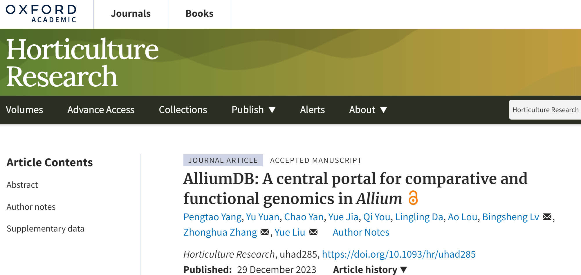 近日,太阳成集团tyc33455大葱分子设计育种创新团队在国际著名期刊Horticulture Research发表题为 AlliumDB: A central portal for comparative and functional genomics in Allium的研究论文。该研究通过整合葱属多个物种的基因组、转录组、变异组、表型组等数据,构建了一个葱属比较基因组学和功能基因组学数据库,为葱属作物遗传育种研究提供了重要的数据资源和分析平台。