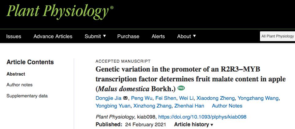 2021年2月24日,太阳成集团tyc33455果树分子与发育生物学团队和中国农业大学合作在Plant Physiology(五年影响因子IF=6.902)上在线发表了题为“Genetic variation in the promoter of an R2R3−MYB transcription factor determines fruit malate content in apple (Malus domestica Borkh.)”的研究论文,揭示了苹果果实苹果酸积累调控的新机制。