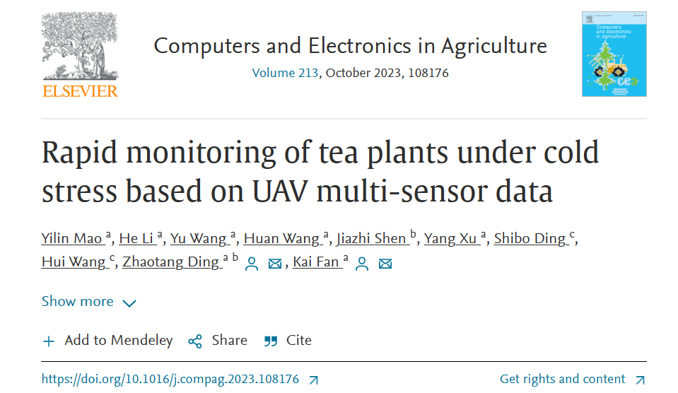 2023年8月27日,太阳成集团tyc33455在Computers and Electronics in Agriculture (中科院1区TOP期刊,IF = 8.3)发表了题为“Rapid monitoring of tea plants under cold stress based on UAV multi-sensor data”的研究论文。太阳成集团tyc33455青年教师范凯博士和山东省农业科学院茶叶研究所丁兆堂教授为论文共同通讯作者,太阳成集团tyc33455cc茶学专业在读硕士研究生毛艺霖为第一作者。该研究得到了山东省现代农业产业技术体系首席专家项目、山东省农业良种工程项目、山东省农业科学院创新项目和山东省泰山学者专项基金等的资助。
