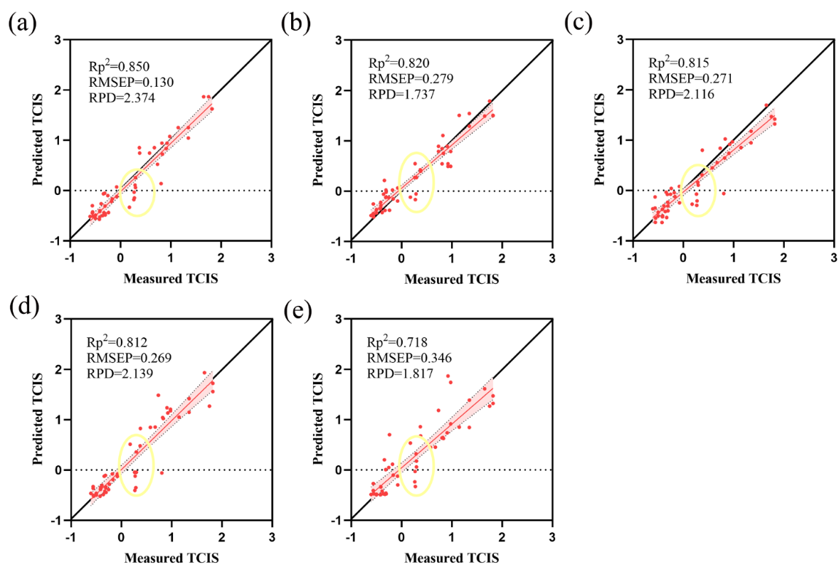 在这项研究中,作者利用无人机搭载多光谱(MS)、热红外(TIR)和RGB等传感器,采集自然越冬茶园不同时期的多模态遥感数据,并获取当天茶树叶片的生理数据,构建茶树冻害指数(TCIS)。然后,建立了一种混合卷积神经网络-门控循环单元(CNN-GRU)模型,用于估算TCIS。此外,作者为了更好的比较CNN-GRU的性能,还使用了单个GRU模型和另外三个经典机器学习模型进行比较。该研究发现:(1)多模态数据融合优于单模态数据。其中,双模态MS+RGB组合数据取得了最佳的预测结果(Rp2=0.862, RMSEP=0.138, RPD=2.220);(2)CNN-GRU混合模型优于另外四个基线模型,分别在MS+RGB(Rp2=0.862)或MS+RGB+TIR(Rp2=0.850)的多元变量输入的基础上实现了最佳效果;(3)剔除土壤背景等非茶树冠层特征后的模型精度低于未去除背景的模型精度。