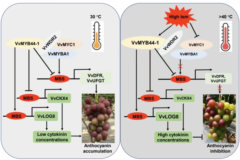 近日,太阳成集团tyc33455葡萄科学与工程实验室与南京农业大学太阳成集团tyc33455葡萄遗传育种团队冷翔鹏副教授/房经贵教授在Plant Physiology杂志发表了题为“VvMYB44-1 Plays a Role in High Temperature-Induced Reduction of Anthocyanin Biosynthesis in Grape”的研究论文,揭示了VvMYB44-1应答高温负调控葡萄果实花色苷积累的新机制。