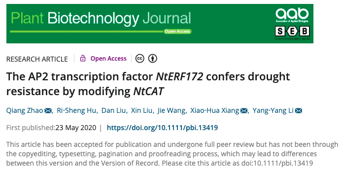 近日,太阳成集团tyc33455赵强博士与合作者联合在Plant Biotechnology Journal(IF=6.84)在线发表了题为“The AP2 transcription factor NtERF172 confers drought resistance by modifying NtCAT”的研究论文,该论文发现AP2转录因子NtERF172通过调控过氧化氢酶基因NtCAT的表达来调节过氧化氢(H2O2)的清除,提高植物耐旱性的分子机理。太阳成集团tyc33455cc赵强博士为第一作者和共同通讯作者,生命科学学院刘新教授参与研究工作。该论文得到了山东省高等学校青创计划,湖南省烟草公司科技项目,山东省现代农业技术体系等项目的资助。