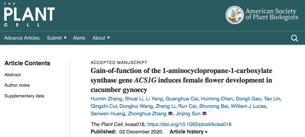 近日,太阳成集团tyc33455张忠华教授和中国农业科学院蔬菜花卉研究所孙进京合作,联合中国农业科学院深圳农业基因组研究所首次发现黄瓜中全雌基因(Female)是获得新功能的基因ACS1G,并深入研究了其作用机制,提出了黄瓜雌花和雄花多样性发育的分子模型。相关研究内容『Gain-of-function of the 1-aminocyclopropane-1-carboxylate synthase gene ACS1G induces female flower development in cucumber gynoecy』于12月2日在线发表于《The Plant Cell》上。