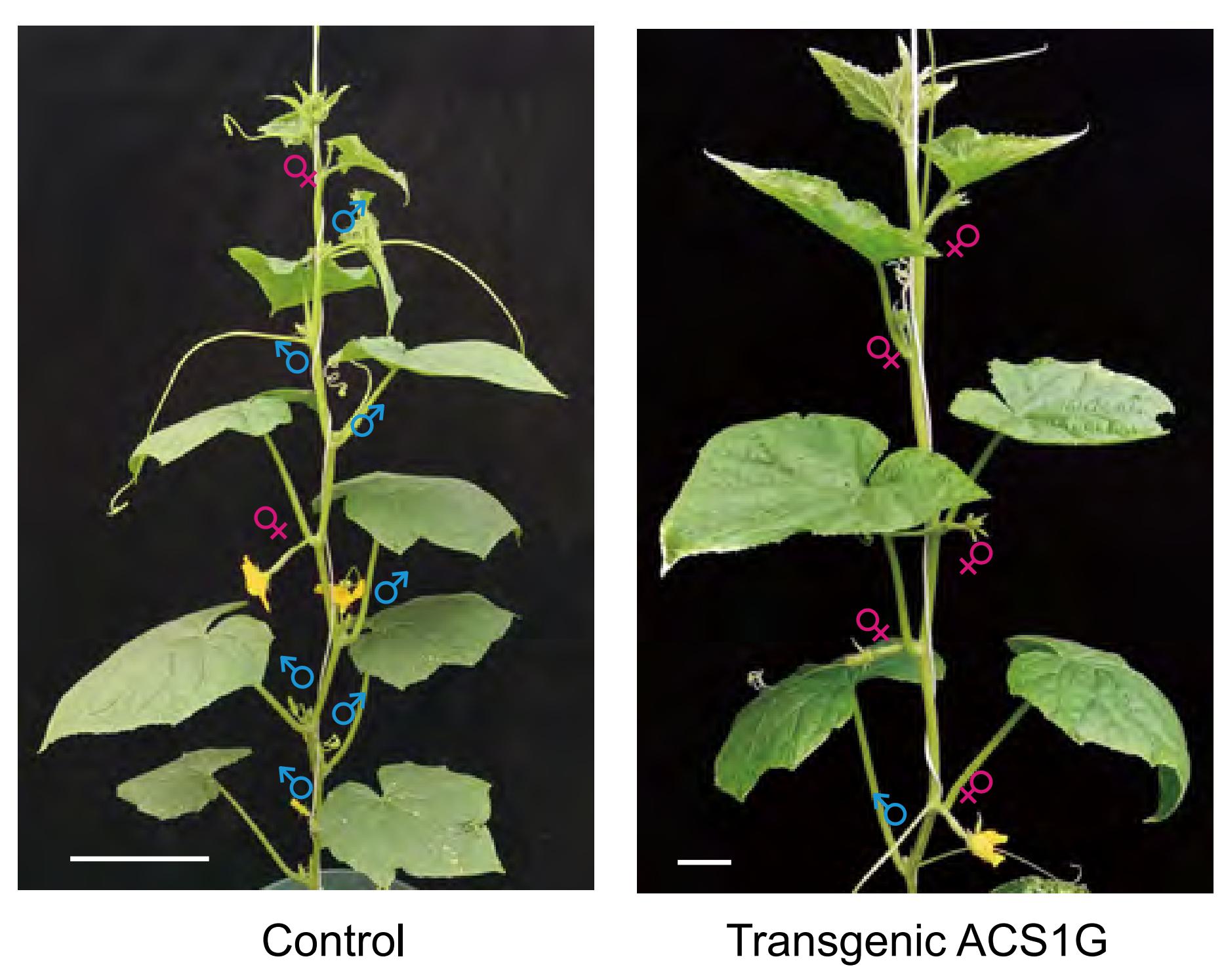 图1 雌雄同株黄瓜植株和转基因(ACS1G)全雌花植株