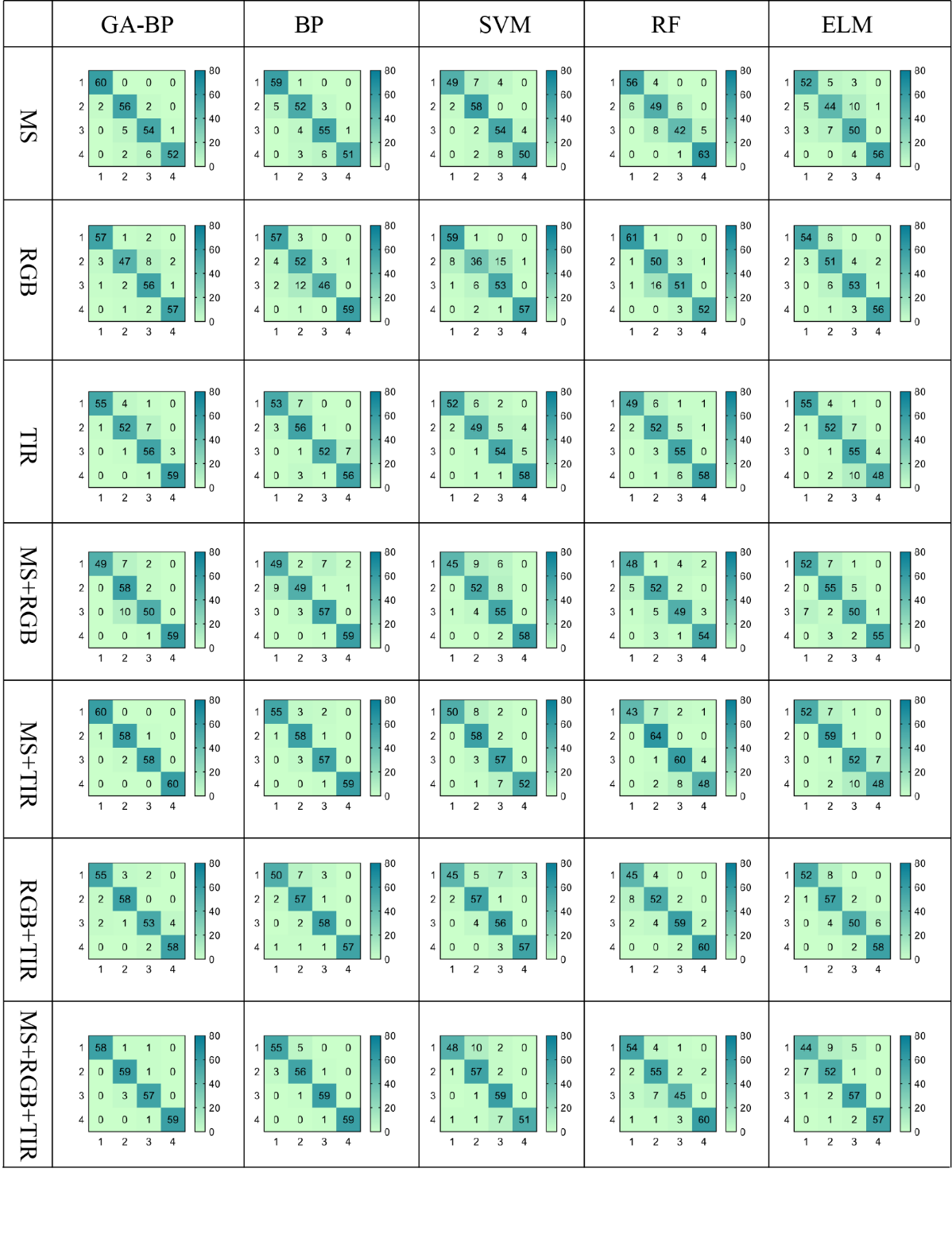 研究中,团队成员提出了RSDCM(基于遥感的干旱分类模型),一种改进的遗传算法-反向传播(GA-BP)结合MS + TIR框架,通过遗传算法的全局搜索优化初始权重和阈值(隐藏层=1,隐藏层中的神经元=5,50代,群体大小=5,NonUnifMutation算子)来避免局部最小值并加速收敛。一个配备MS,RGB,TIR传感器收集了来自干旱的多源数据,将RSDCM模型与单一BP算法和三种经典的机器学习模型(SVM、RF、ELM)进行了对比。