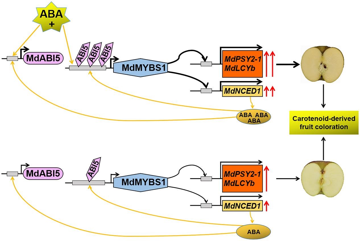 进一步研究发现,MdMYBS1启动子区含有ABA响应元件ABRE-motif,并鉴定了能结合ABRE-motif的MdABI5转录因子,MdABI5通过增强MdMYBS1的启动子活性,促进类胡萝卜素和ABA的积累。通过功能互补验证,在过表达MdMYBS1的苹果愈伤组织中干扰MdABI5和在过表达MdABI5的苹果愈伤组织中干扰MdMYBS1,结果表明MdABI5为MdMYBS1的上游调控子。此外,外源ABA处理能增强果实中MdABI5和MdMYBS1的转录水平。