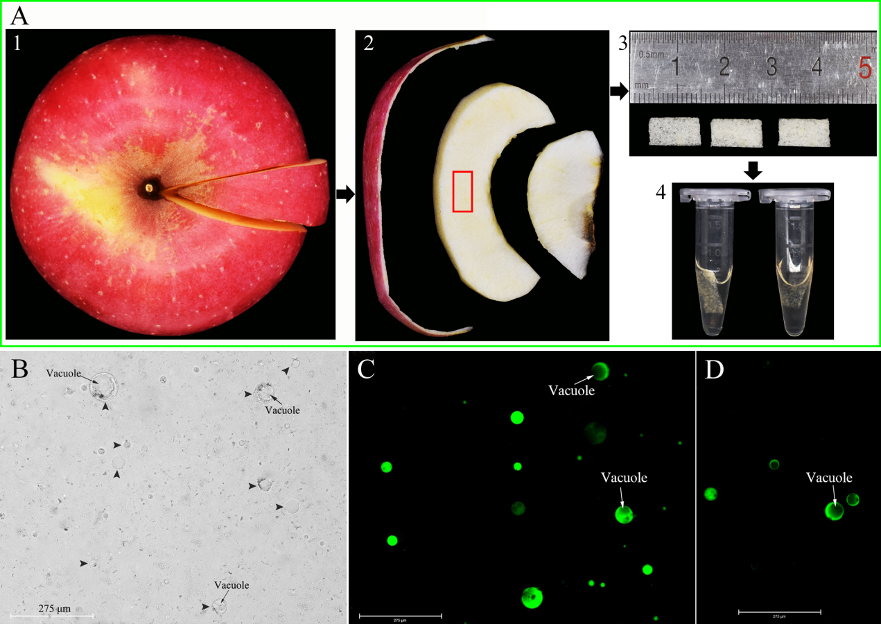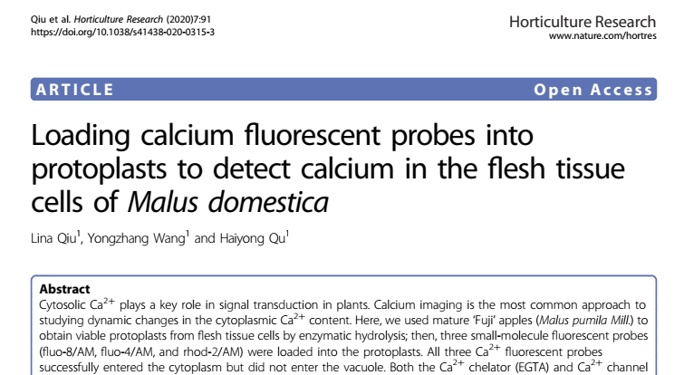 2020年6月,太阳成集团tyc33455果树生理与栽培课题组在园艺领域顶级期刊Horticulture Research(一区)在线发表了题为“Loading calcium fluorescent probes into protoplasts to detect calcium in the flesh tissue cells of Malus domestica”的研究论文。该论文首次发现Fluo-8/AM等小分子荧光探针可以染色苹果果肉胞质中的Ca2+,可用于检测细胞质中Ca2+的时空变化。太阳成集团tyc33455硕士研究生仇丽娜为本论文第一作者,太阳成集团tyc33455王永章教授和屈海泳副教授为论文的共同通讯作者。该论文得到了国家重点研发计划项目(2016YFD0201120)的资助。
