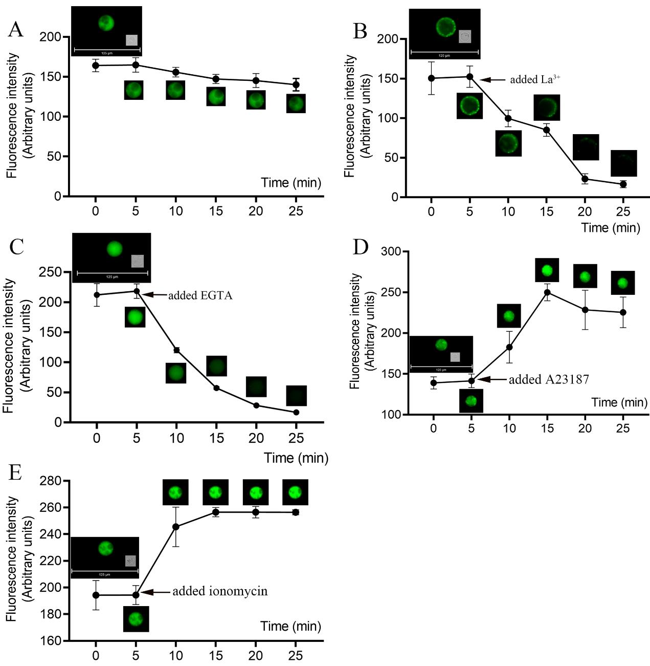Fig. 2 Loading of three kinds of Ca2+ fluorescent dyes into the protoplasts from flesh cells