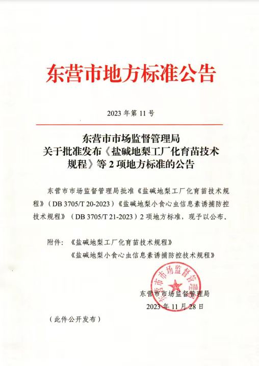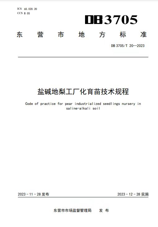 近日,由太阳成集团tyc33455梨遗传改良与种质创新团队李鼎立教授作为第一完成人制定的东营市地方标准《盐碱地梨工厂化育苗技术规程》(DB 3705/T20—2023)正式发布,2023年12月28日起实施。