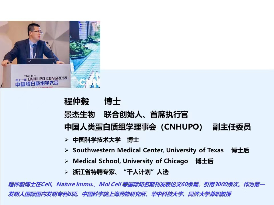 程仲毅,博士,研究生先后毕业于浙江大学、中国科学技术大学,2006.09-2010.10于美国西南医学中心与芝加哥大学Ben May研究所从事蛋白质组学与表观遗传学的博后研究,2010.10-2011.04 担任美国芝加哥大学Senior Research Scientist。现任杭州景杰生物科技股份有限公司联合创始人,CEO,中科院上海药物研究所特聘兼职教授,同济大学,华中科技大学客座教授,浙江省“千人计划”,浙江省特聘专家,杭州市"521全球引才计划”入选者。