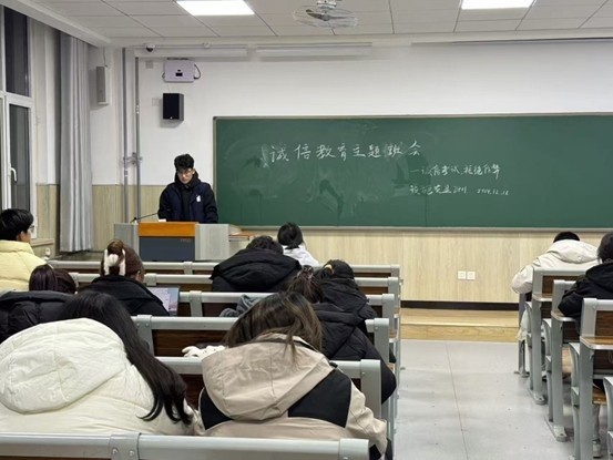 为严肃考风考纪,厚植学生诚信意识,倡导诚信考试,营造良好的考试环境,12月16日晚,太阳成集团tyc334552024级本科各班级于平度校区教学区召开期末考前诚信教育主题班会。