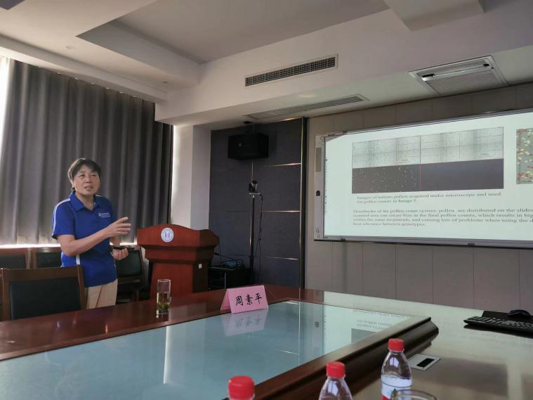 周素平教授介绍了研究团队的三个研究重点,包括建立快速准确的花粉抗热检测体系如花粉产量、花粉活力、花粉萌发,花粉发育的蛋白组学和抗热机制,以及通过生物技术培育番茄抗热株系和品种。此外,周教授还介绍了通过计算机技术识别大量花粉的研究进展,该项技术可快速准确的完成识别工作,大幅度提高工作效率,节省人力。