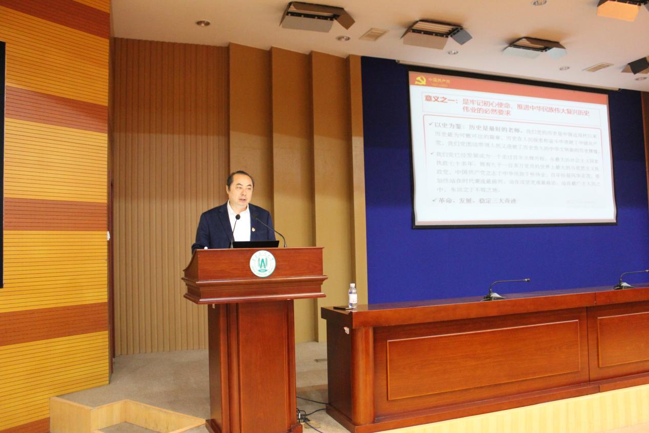 刘新民以“传承红色基因,推进伟大事业”为题,向参会人员讲授了党史学习教育的意义、内容、要求三个方面的重要内容。他指出,开展党史学习教育的主要意义,一是牢记初心使命,推进中华民族伟大复兴历史伟业的必然要求;二是坚定信仰信念、在新时代坚持和发展中国特色社会主义的必然要求;三是推进党的自我革命,永葆党的生机活力的必然要求。随后他强调,全体党员干部要做到以史为鉴,传承红色基因,树立正确的党史观,学史明理、学史增信、学史崇德、学史力行,达到树牢初心使命,增强斗争精神的目的,把思想和行动统一到习近平总书记重要讲话精神上,切实增强“四个意识”、坚定“四个自信”、做到“两个维护”,把握历史规律,增强开拓奋进的信心、勇气和力量。最后,他要求在党史学习教育中要做到理论联系实际,学以致用,知行合一,深入挖掘传承党史中优秀基因,从百年党史中感悟“三牛”精神,结合实际工作,为学校高质量、内涵式发展贡献出自己的力量。
