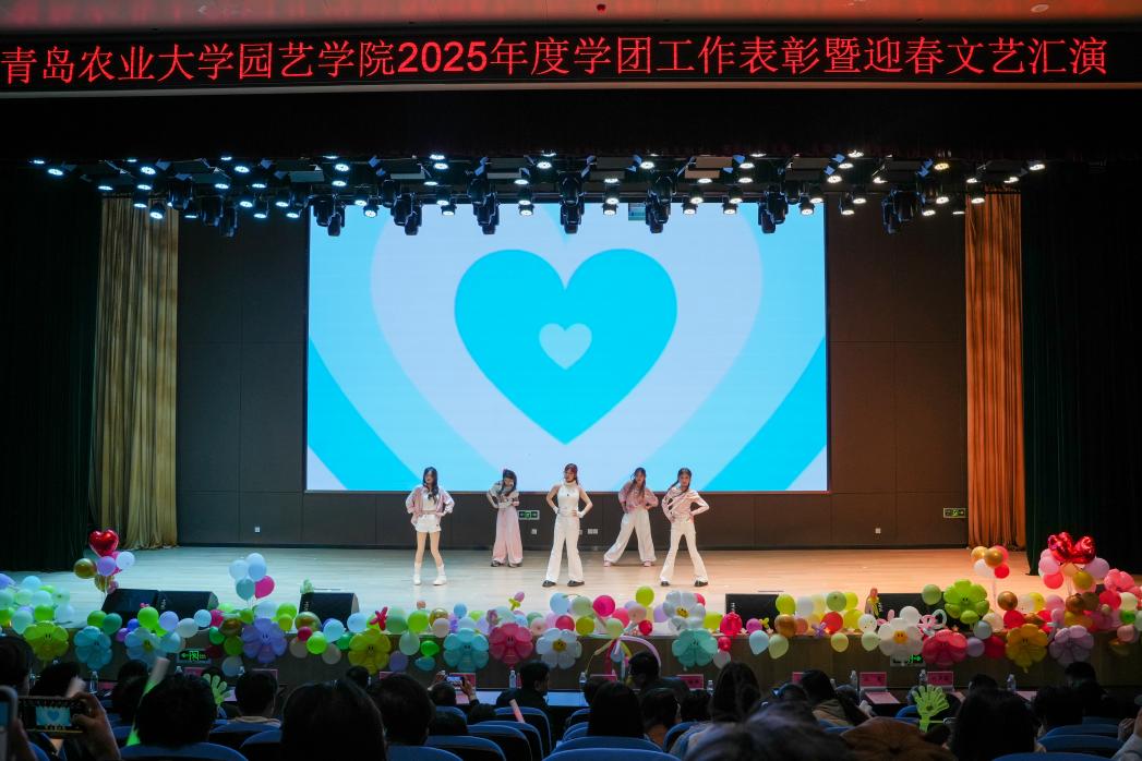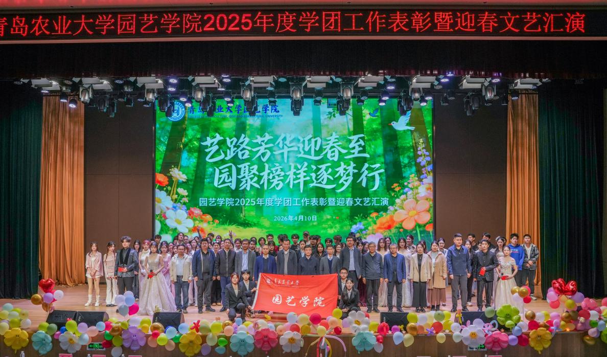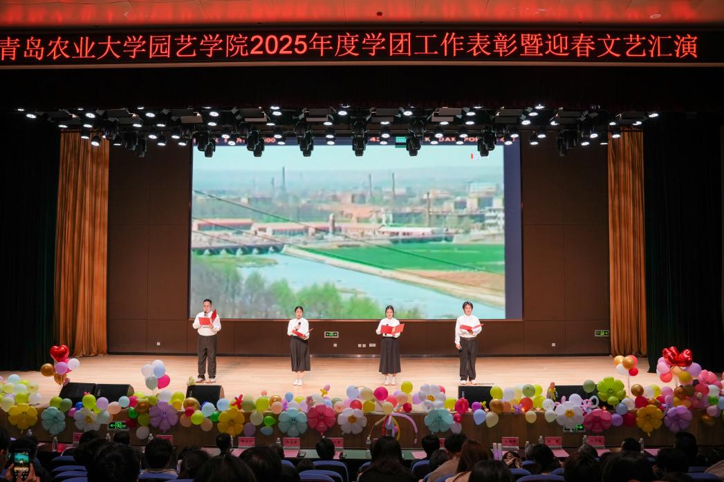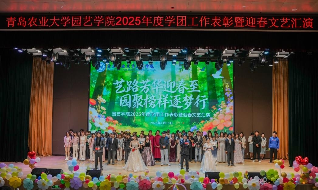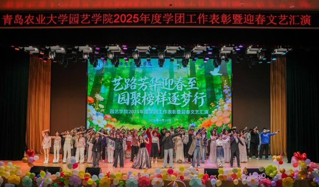 第三篇章“逐梦新程·共赴春光”温情启幕。《船长》《风吹麦浪》《身骑白马》歌曲串烧,婉转旋律勾勒青春向往,引发全场广泛共鸣。《声动四季 园艺诗篇》朗诵气势昂扬,深情赞颂园艺事业的初心使命,生动传递学院立德树人的育人坚守。《what is love》舞姿轻盈灵动,为晚会增添一抹柔美亮色。最后,在全体师生共同合唱《相亲相爱》的温暖旋律中,晚会圆满落下帷幕。