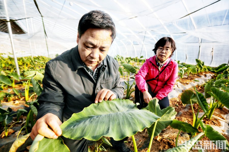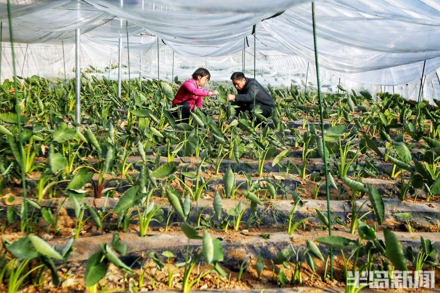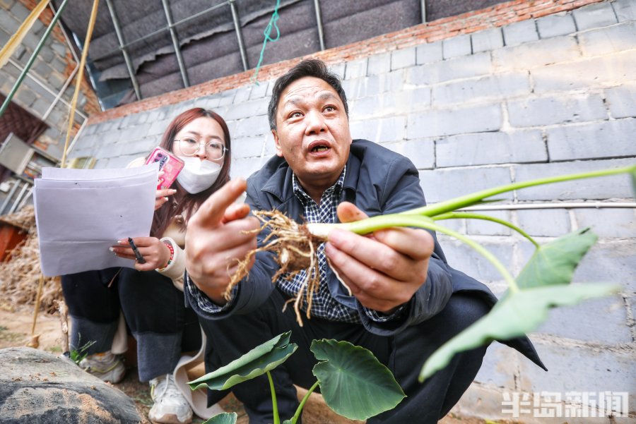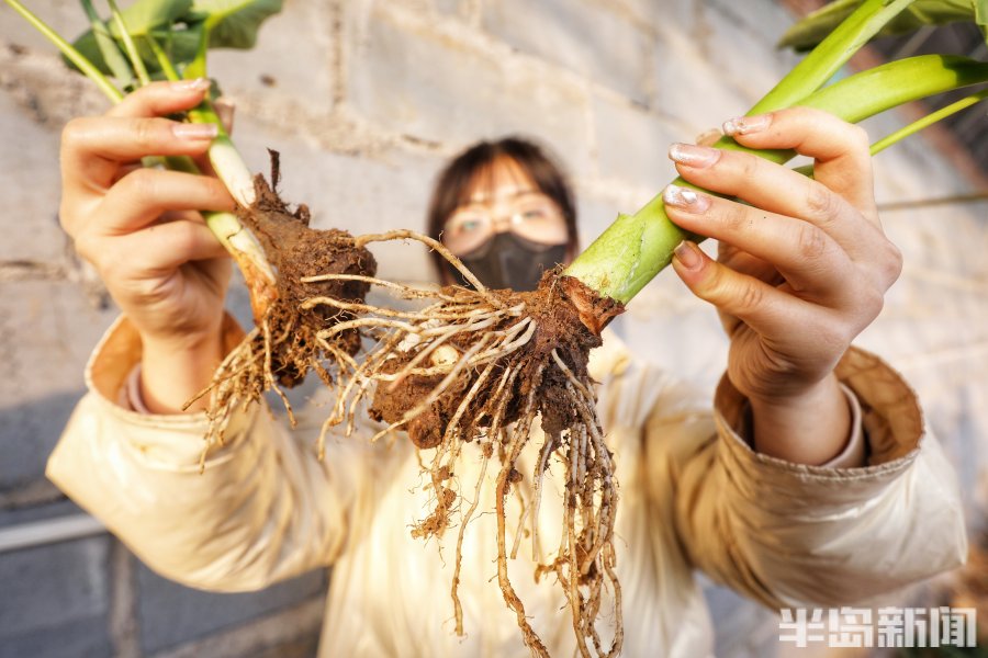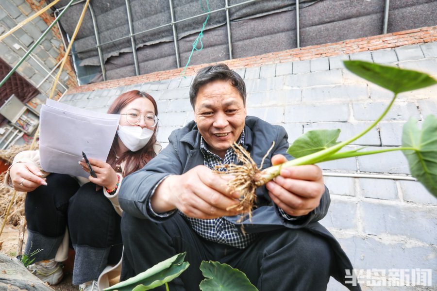 3月2日,青岛市即墨区南邱家白庙村的一处温暖的大棚里郁郁葱葱,3万余棵芋头苗长势旺盛,达到了可以移栽入田的标准。几位专家带着学生在这里下地观察研究,采集数据,看着挖出的芋苗根系的长势健壮,大家喜上眉梢。