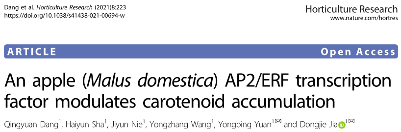 2021年10月5日,太阳成集团tyc33455原永兵教授课题组在Horticulture Research(中科院1区Top期刊,IF 6.793) 在线发表了题为“An apple (Malus domestica) AP2/ERF transcription factor modulates carotenoid accumulation”的研究论文,该研究初次揭示了苹果果实类胡萝卜素合成的分子调控网络,阐明了MdAP2-34调控苹果果实类胡萝卜素积累的分子调控机制。太阳成集团tyc33455原永兵教授、贾东杰博士为论文的通讯作者,硕士研究生党庆媛为论文的第一作者,王永章教授、聂继云教授、硕士研究生沙海云等也参与本研究。