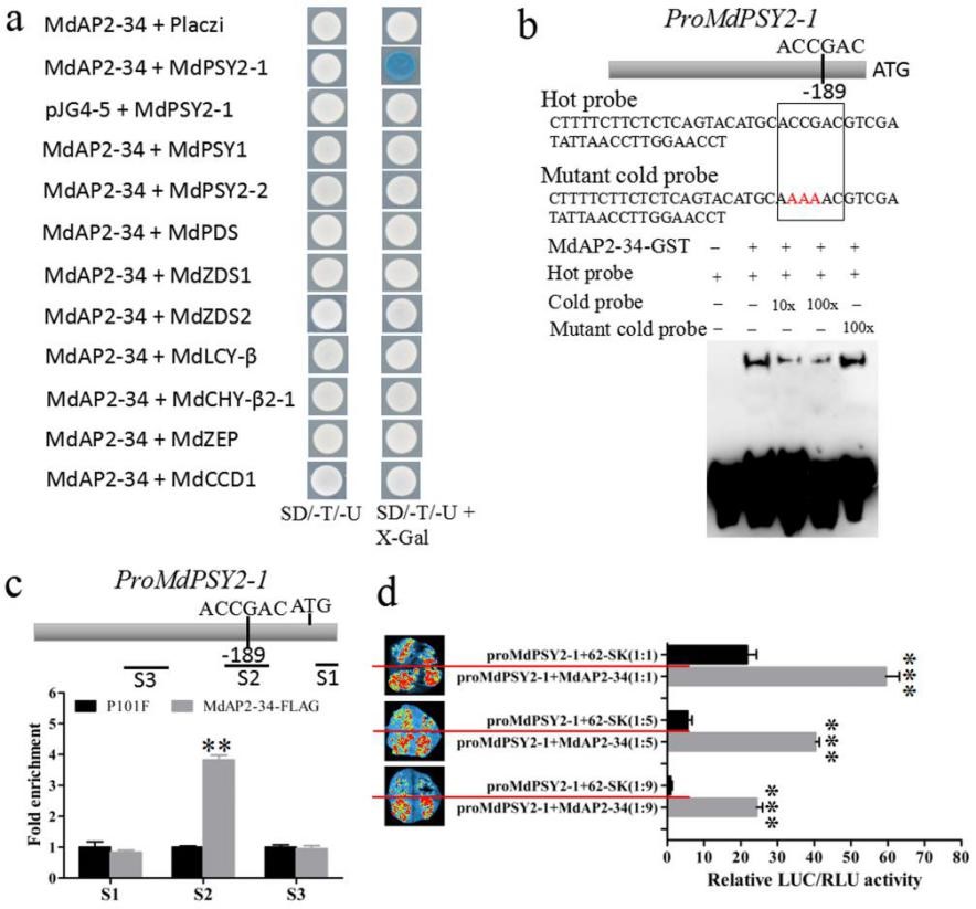 图2. MdAP2-34与MdPSY2-1启动子直接互作并促进MdPSY2-1基因表达