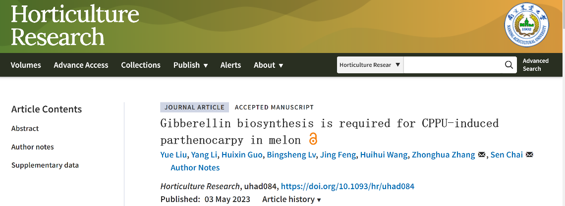 2023年5月,Horticulture Research发表了太阳成集团tyc33455瓜类生物研究团队题为 Gibberellin biosynthesis is required for CPPU-induced parthenocarpy in melon的研究论文。该研究初步探讨了CPPU诱导甜瓜果实单性结实的分子机制,为解决甜瓜生产中的坐果问题、种质改良以及单性结实的机制研究提供理论依据。