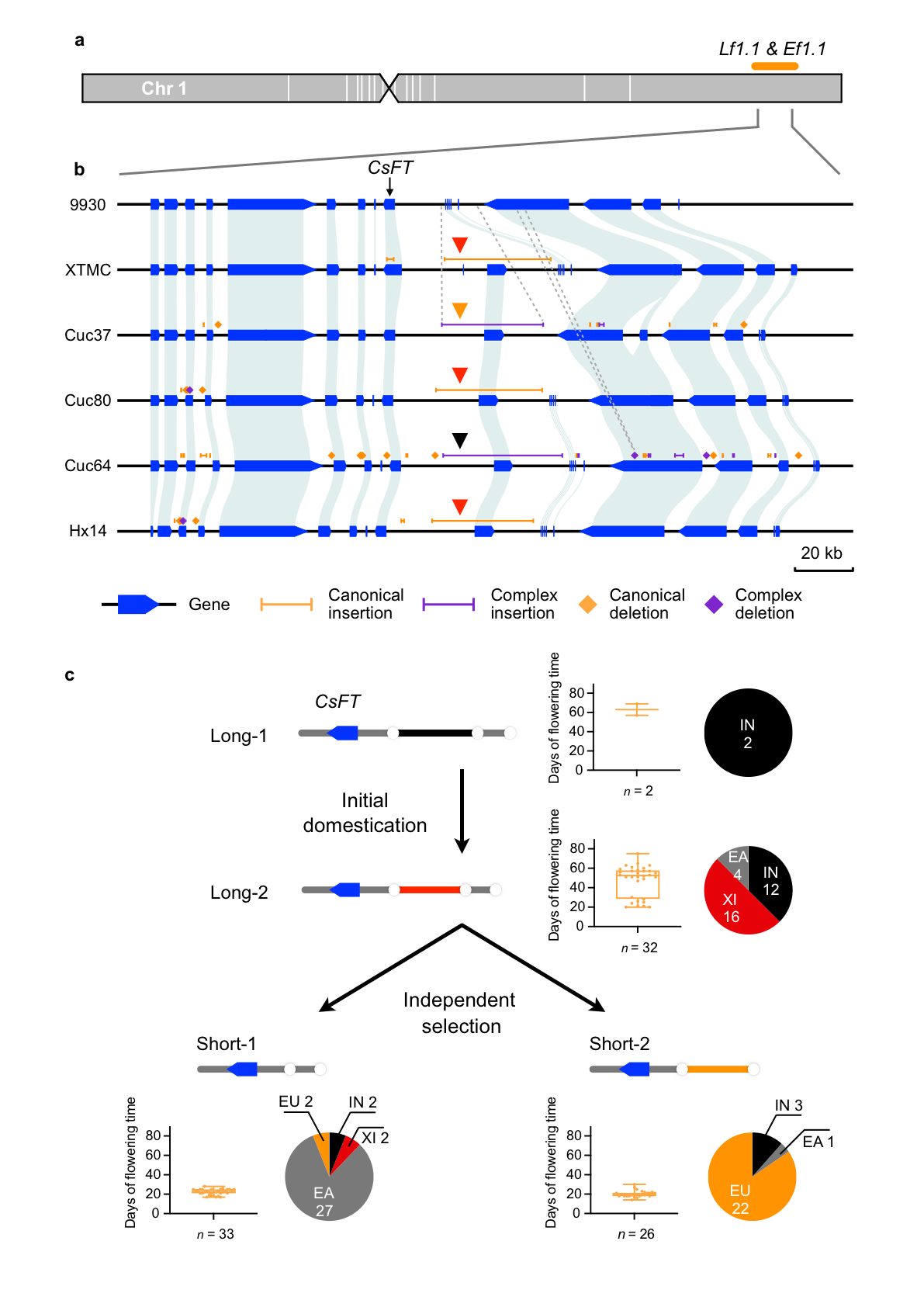 为进一步利用图形结构泛基因组揭示影响黄瓜驯化和重要农艺性状的遗传变异,该研究对黄瓜果刺果瘤、开花时间和根系发育等性状进行了深入分析。在已知果瘤关键基因CsTu的外显子上新发现了一个51-bp的结构变异,可破坏CsTu基因功能影响果瘤,并且对果刺果瘤多个基因在黄瓜115份核心种质的遗传变异进行了系统分析,揭示了结构变异在果实刺瘤性状相关基因中的驯化和育种选择历程(图3)。开花时间在农作物驯化和地理适应的过程中发挥重要作用,现代栽培黄瓜的开花时间都远远早于野生黄瓜和西双版纳半野生黄瓜,基于图形结构泛基因组,该研究新鉴定出CsFT上游1个44-kb的结构变异,只在2份开花极晚 (~60d) 的野生黄瓜种质中出现,系统发生关系表明这2个野生种质可能为其他黄瓜的祖先类型,并提出了CsFT位点在黄瓜驯化和和育种选择过程中的演化历程,加深了对黄瓜适应性演化机制的理解(图4)。此外,该研究还发现PELPK7.1和PELPK7.2基因附近结构变异可能在黄瓜驯化过程根系发育的改变中起重要作用。