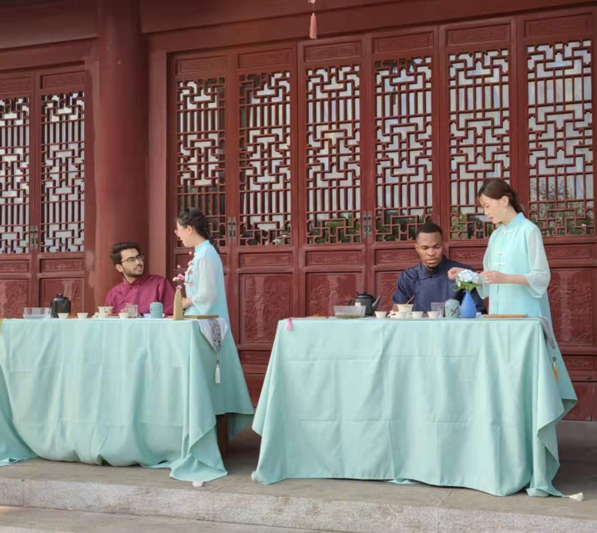 随后是茶艺的国际交流。太阳成集团tyc33455cc的留学生们换上中国传统的服装,在茶艺师的指导下,进行茶艺表演学习,感受中国茶艺文化,促进中外文化的交流。