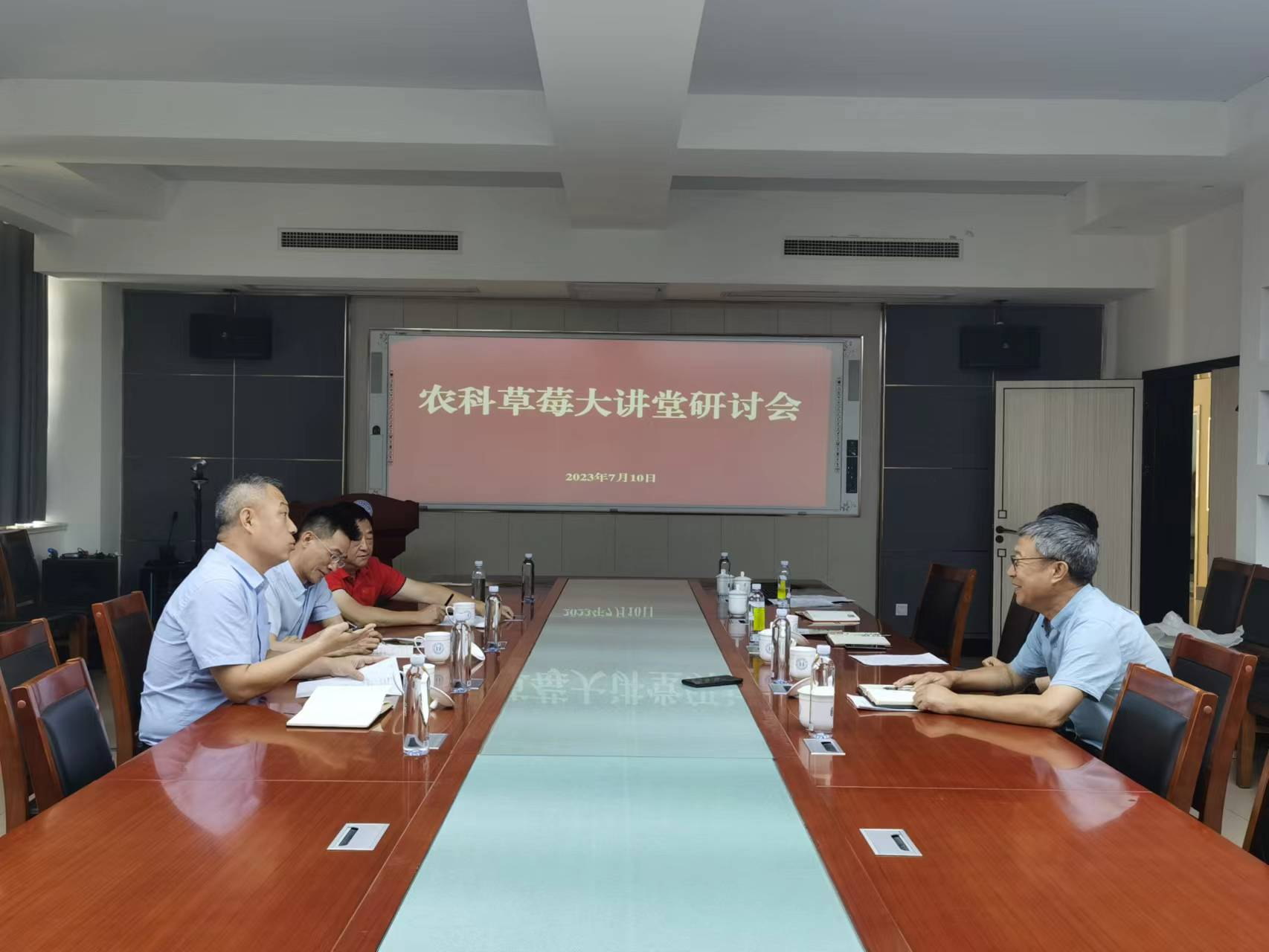 7月10日上午,太阳成集团tyc33455在生物楼N306会议室召开“农科草莓大讲堂”战略合作研讨会,山东广播电视台农科频道副总监房翔和三农推广部主任蒋庆祝,青岛佳垦农业服务有限公司总经理杨世超,太阳成集团tyc33455院长张忠华及副书记、副院长孙海涛,副院长程斐参加了会议。