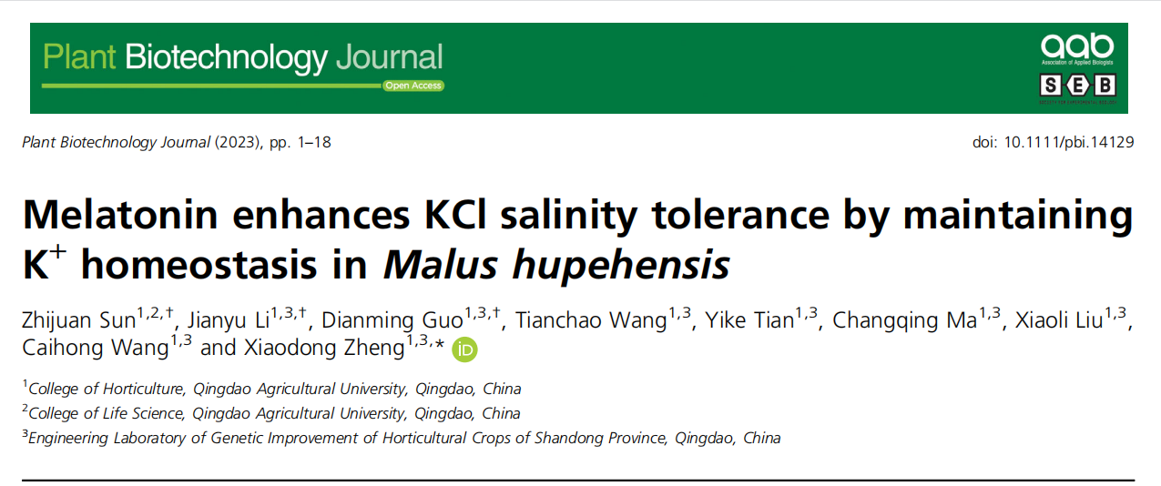 2023年7月19日,太阳成集团tyc33455王彩虹教授课题组在Plant Biotechnology Journal(一区TOP期刊,影响因子13.8)在线发表了题为“Melatonin enhances KCl salinity tolerance by maintaining K+ homeostasis in Malus hupehensis”的研究论文。该研究通过对KCl胁迫下的不同抗性砧木进行外源褪黑素处理,发现褪黑素可以缓解它们受到的KCl胁迫,之后通过ChIP-seq、EMSA等试验系统的揭示了褪黑素通过MT-WRKY53-GORK1/NHX2通路维持细胞钾离子稳态,提高苹果对KCl胁迫抗性的调控机制。