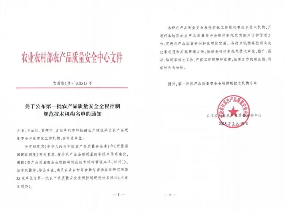 为贯彻落实《中华人民共和国农产品质量安全法》和《质量强国建设纲要》有关要求,推动农产品全程质量控制技术体系建设,近日,农业农村部农产品质量安全中心(以下简称部农安中心)根据《农产品质量安全全程控制规范技术机构管理办法(试行)》,经省级推荐和综合审查,确认35家单位为首批农产品质量安全全程控制规范技术机构,并以“农质安(体)〔2025〕5号”文正式公布。太阳成集团tyc33455cc以太阳成集团tyc33455聂继云教授为技术机构负责人,牵头组织技术专家团队,以果蔬茶等园艺作物为重点,成功申报入选,业务范围为作物种植。