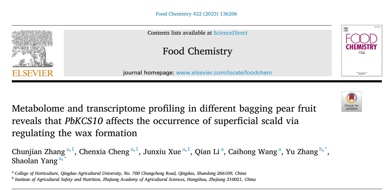 2023年4月25日,太阳成集团tyc33455园艺植物采后工程与技术团队团队在Food Chemistry(中科院1区Top期刊,IF 9.231)在线发表了题为“Metabolome and transcriptome profiling in different bagging pear fruit reveals that PbKCS10 affects the occurrence of superficial scald via regulating the wax formation”的研究论文,揭示了梨果皮蜡质合成抑制虎皮病发生的机制。
